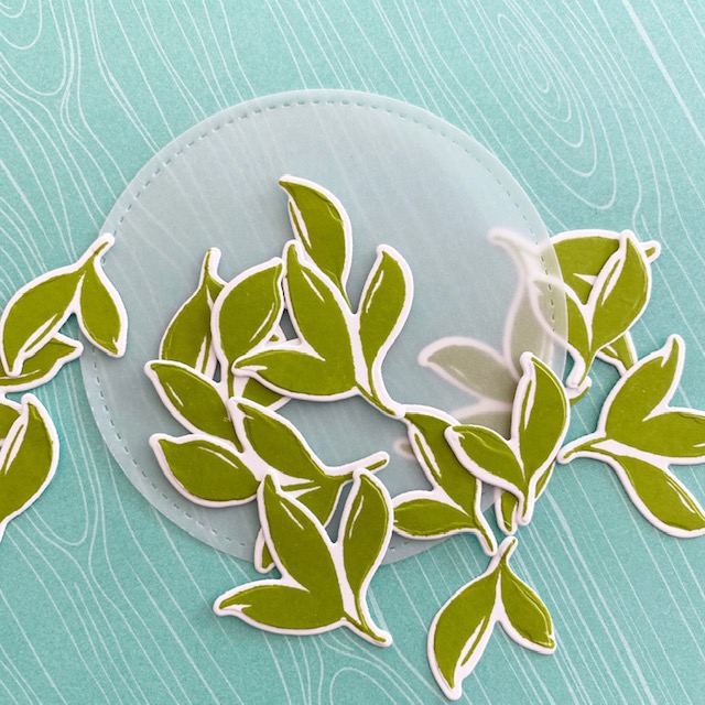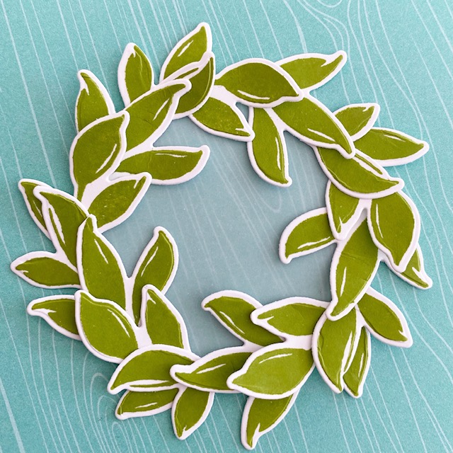I decided to create a 10,5 cm square card (folded) and then built my wreath on Vellum using Glue Dots…