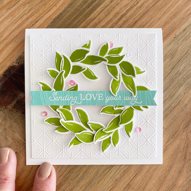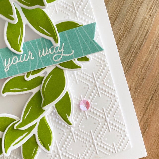 For extra texture as well as an extra layer I dry embossed a 9,5cm square Whisper White card with the Dainty Diamond 3D embossing folder, mounted the Vellum wreath on top and then added the layer to my folded card square. To finish of my card I added a banner with my sentiment heat embossed in White and sequins from the Woven Thread Sequin Assortment.