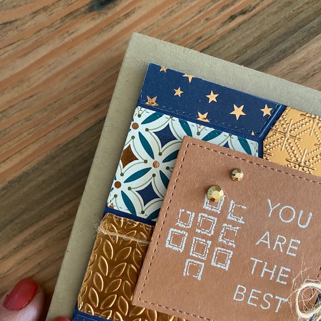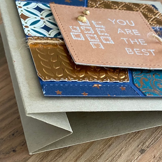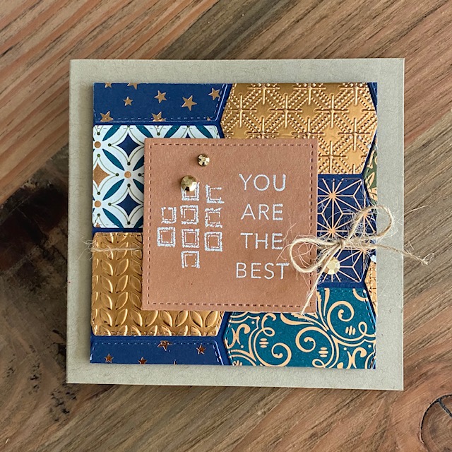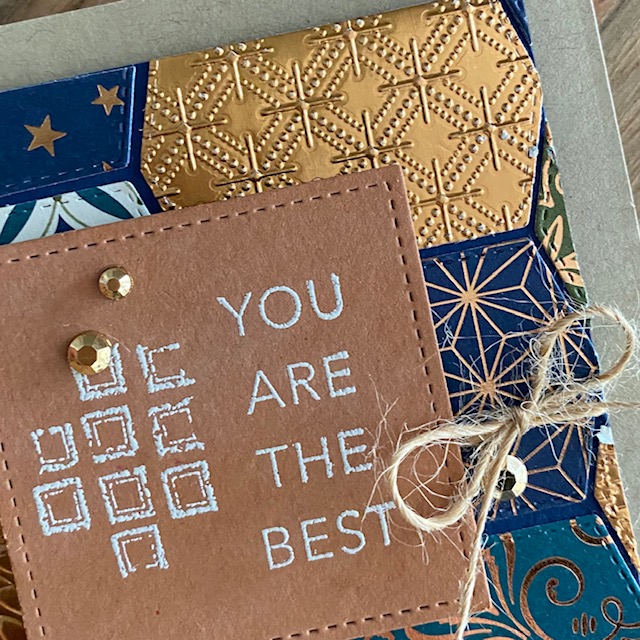 I die cut 2 pieces each from the foiled patterned and adhered the pieces to Night of Navy card using Stampin’ Seal and then trimmed the piece to a 9 cm square card before tying a Linen Thread bow around. This layer was adhered to the card base with Dimensionals.To showcase the paper I used one of the labels from the Tasteful Labels Die set. The sentiment was heat embossed with White Stampin’ Embossing Powder onto a Stitched square die piece.
