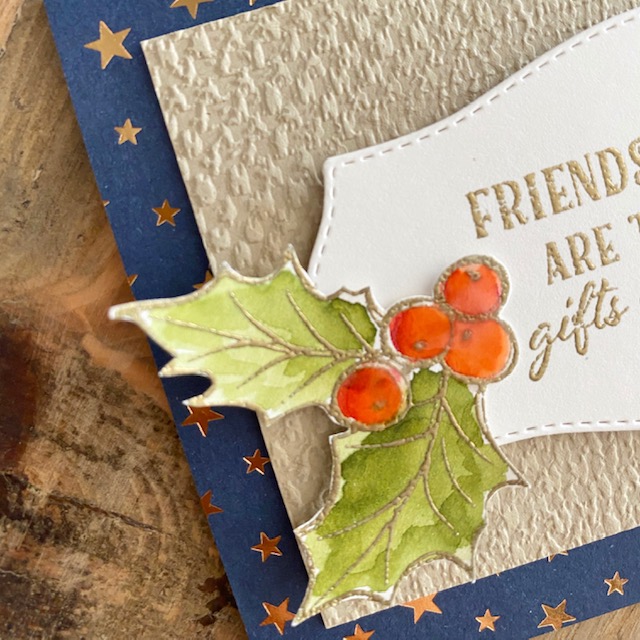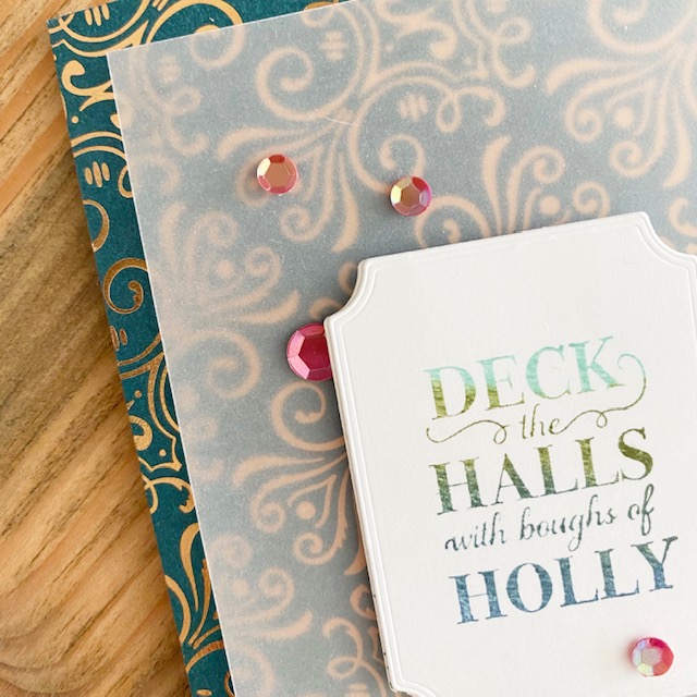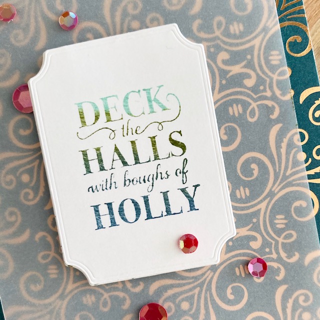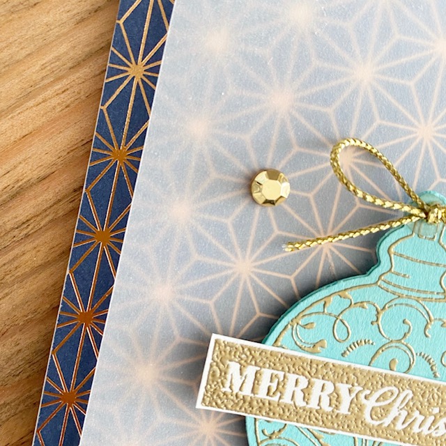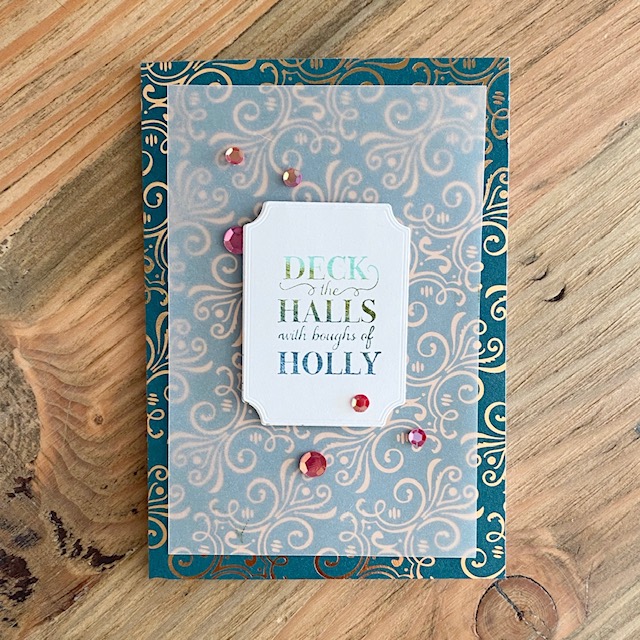 I found that the Gold Stampin’ Emboss Powder works perfectly with the Copper foiled paper and as shown previously on this card. So does the Gilded Gems.