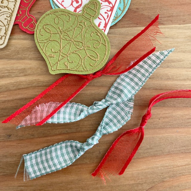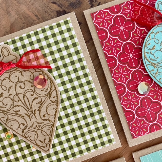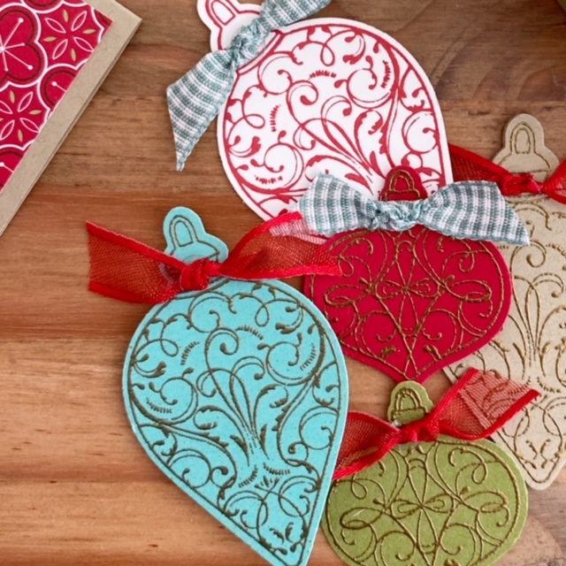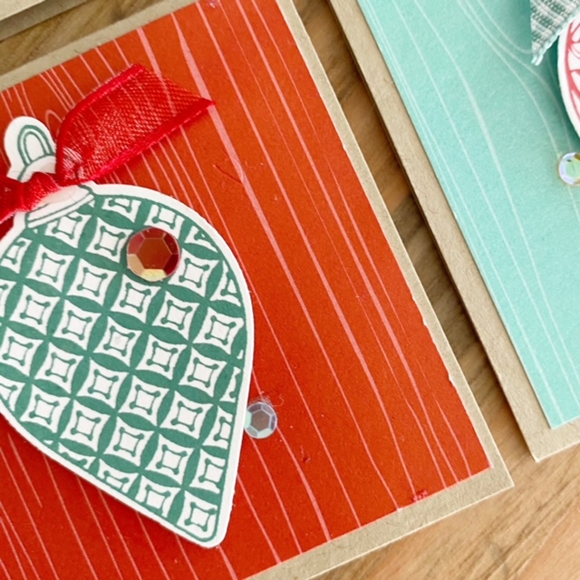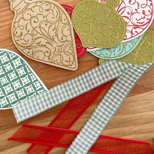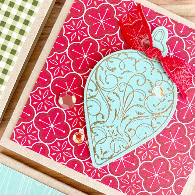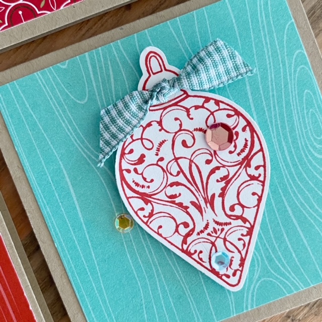 I stamped and punched 4 similar ornaments from the stamp set, folded the ornaments in half and adhered them together (see image above). I love how the Real Red Sheer Ribbon and sequins finishes it all off!