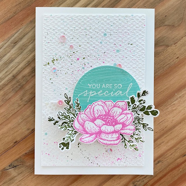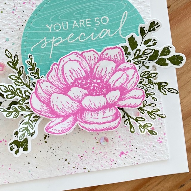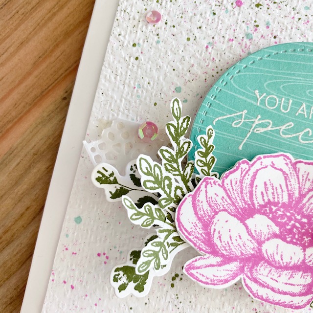I started with a Thick Whisper White card base. Then I added ink splatters (Magenta Madness, Coastal Cabana and Mossy Meadow) to my background layer, before embossing with the Tasteful Textile 3D Embossing folder. After stamping the flower and the leaves from the Tasteful Touches Stamp set, I fussy cut the images. I also used the leaves stamp from the Positive Thoughts stamp set (the coordinating die is from the Nature’s Thoughts Die set) to add more Greenery to my card front. The sentiment was heat embossed in White onto a stitched circle (I used the Coastal Cabana woodgrain finish from the Brights pack). To anchor my sentiment and cut out images, I die cut the border from the Fabulous Florals die set from Vellum. Even though very subtle, it did the trick!