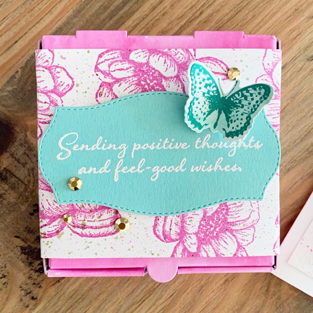 For the boxes I created belly bands by adding splatter to A4 Whisper White card stock and the stamped the flower image in Magenta Madness. The belly band for the pizza box measures 8cm in width and the belly band for the tiny treat box measures 4 cm in width. The labels were die cut with the Tasteful Labels dies. I used all sorts of gems to decorate my projects!