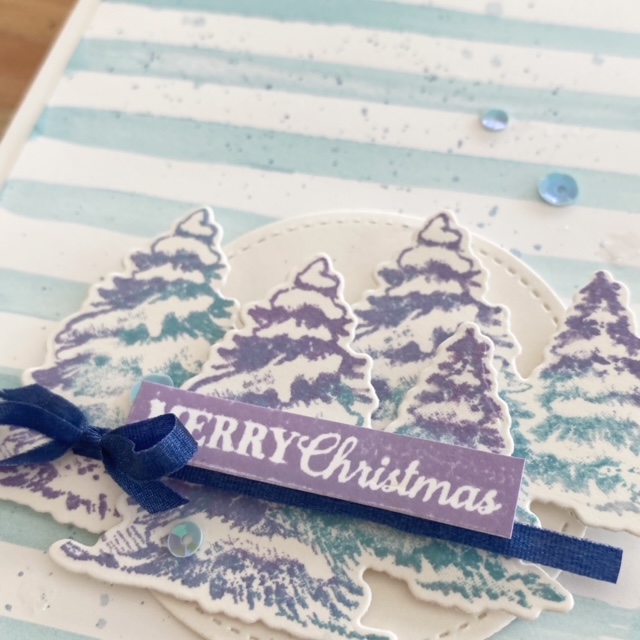 I started with a stripy watercolor background in Balmy Blue (for extra interest I also added Night of Navy splatters) and then stamped and die cut the tree image stamp three times, before layering them onto a Stitched Circle die. I finished off my card with the stunning Woven Threads Sequin Assortment and the Night of Navy ribbon from the Playing with Patterns ribbon combo pack.