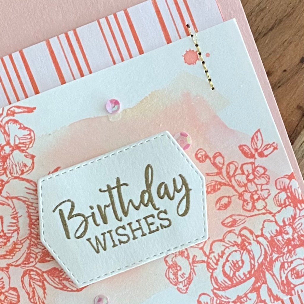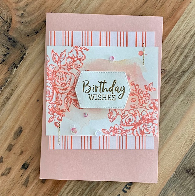 I started with a Blushing Bride card base. On Shimmery White card stock (my favorite for adding watercolor) measuring 10 cm x 8 cm, using the wide brush from the Water Painters, I painted I light wash of Flirty Flamingo. Then (also with Flirty Flamingo ink) I stamped the floral image from the Fancy Phrases cling stamp set in two of the corners. I layered the watercolor piece onto the beautifully soft, stripy paper from the Playing with Patters DSP stack (9.5 cm x 10.5 cm) – I used my sewing machine to add Gold stitching for a little shine. The sentiment was heat embossed in Gold and I also added a few sequins from the Artistry Blooms Sequins for more sparkle.