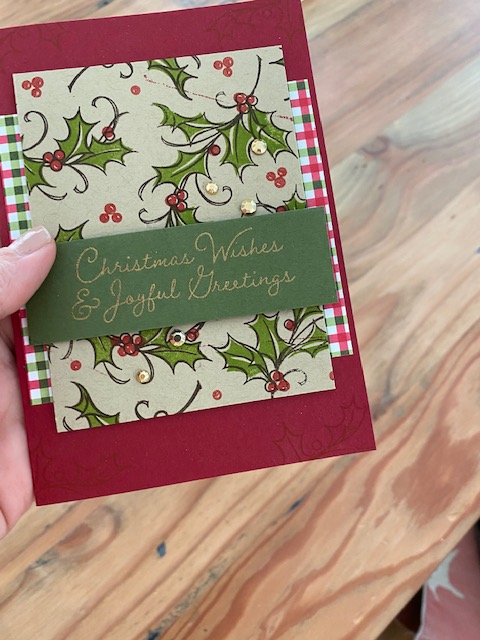 I stamped the outline of the Holly with Early Espresso ink, filled the leaves with Granny Apple Green and the berries were stamped with Real Read ( I used the brighter colors to stamp on the Crumb Cake card stock). The sentiment (from the Snow Wonder stamp set) was heat embossed in Gold. I finished off my card with a few Gilded Gems.