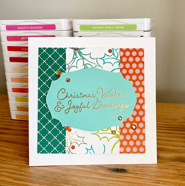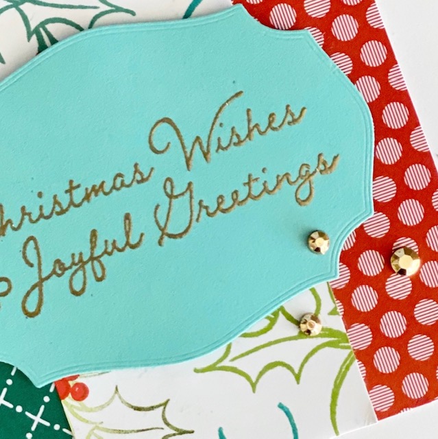 My second card starts off with the same design but different remnants of DSP as well as a leftover piece stamped with the Joyful Holly stamp set. The sentiment was heat embossed in Gold onto Coastal Cabana card stock and cut with one of the dies from the Tasteful Labels Die set.