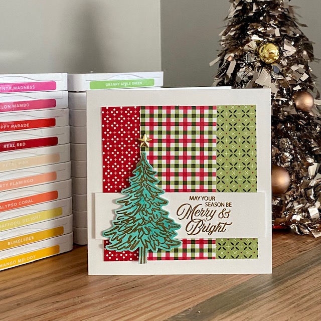 My card base measures 12 cm x 12 cm (folded) and the strips measure 5 cm x 10 cm each (with the center panel overlapping the side panels). The sentiment strip measures 3 cm x 11 cm. The pine tree was painted with Bermuda Bay watercolor and then heat embossed in Gold, before die cutting with the coordinating die.