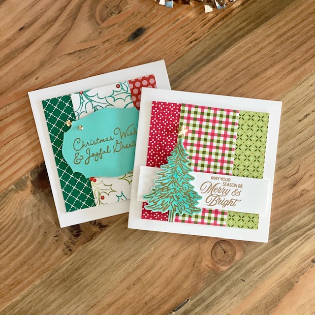 This week I am starting to work on the cards and gifts for the wonderful teachers (and dance teachers) in our lives. I created clean and simple square cards to go with the cute little square Pizza boxes! Not sure yet what I will put in the boxes, but I will be sure to share once I do! I was thinking I yummy piece of Christmas Rocky Road?! Today I am sharing two quick cards that I created with some leftover Designer Series Paper (DSP) I found in my stash.