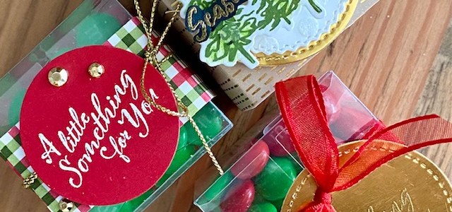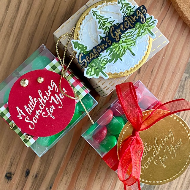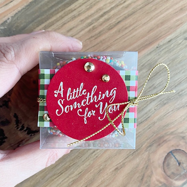 A quick share today! I decorated the Clear Tiny Treat Boxes to create the cutest Christmas table favors! For the most part I used scrap pieces of cardstock and paper to decorate, quick easy and a lot of fun!
