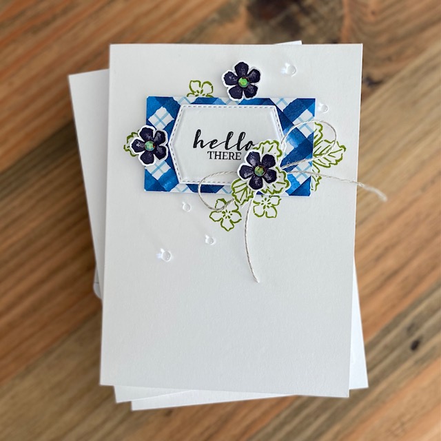 I started off by stamping the floral image twice in Granny Apple Green on a Basic White card base (place the DSP piece onto the base to get an idea of where to stamp). Stamp the outline of the small blossoms three times and then stamp the solid blossom to fill the outlines. I used a narrow strip of Basic White for this.