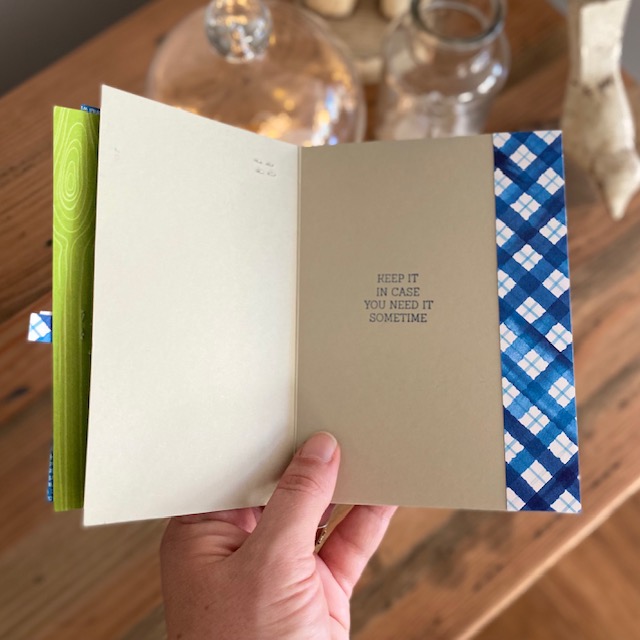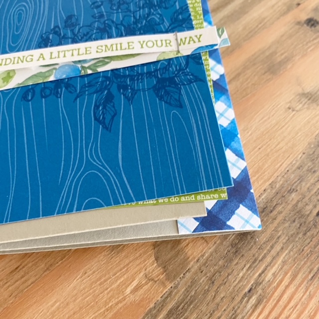 I started with a fun fold Sahara Sand card base measuring 14.5cm x 29.7cm, scored on the long side at 10.5cm and 21cm. I stamped the floral stamp from the Fancy Phrases stamp set on the woodgrain Pacific Point patterned paper using the coordinating ink (I stamped it off the page to the right) and layered it onto Granny Apple Green patterned paper (both papers from the Brights Designer Series Paper assortment. The sentiment was stamped in Granny Apple Green onto a Thick Basic White strip and layered onto a strip from the Berry Delightful DSP. On the inside I added a strip of patterned paper from the same DSP measuring 12.5cm x 14.5cm.