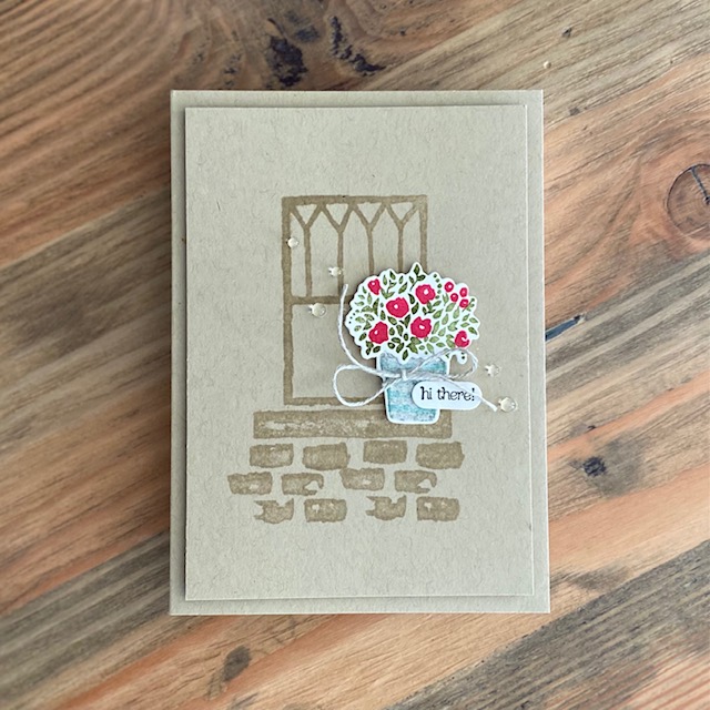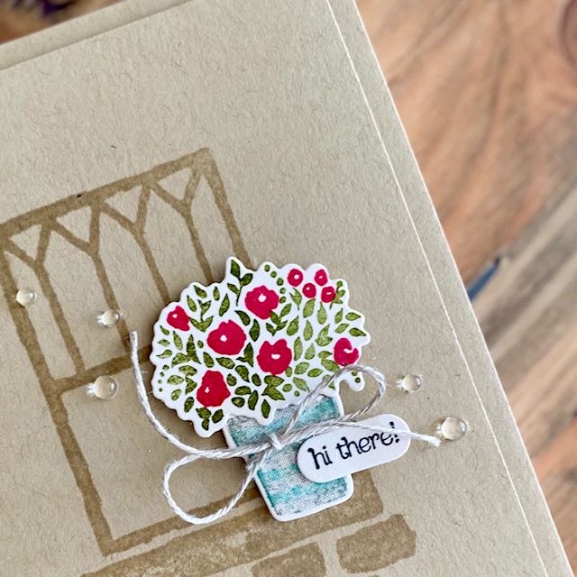 The Welcoming Window Bundle makes it so easy! To add interest to my Crumb Cake base as well as an extra layer, I stamped a few of the images from the Welcoming Window stamp set with Versamark Ink (you can also use Crumb Cake ink) on to a Crumb Cake layer measuring 13.5cm x 9.5cm. I stamped the flowers with Melon Mambo ink and the leaves with Mossy Meadow ink before die cutting with the coordinating die from the Window Flower Box Dies. The the flower pot was first stamped with Smoky Slate ink and before I added a stripy layer by painting the same clean stamp with Bermuda Bay ink using a Water Painter. I tied a Linen Thread bow around the pot. The cute little ‘Hi there!” sentiment comes from the Many Messages Bundle. Clear gems from the Flowers for Every Season Gems add sparkle to finish off the card.