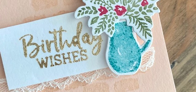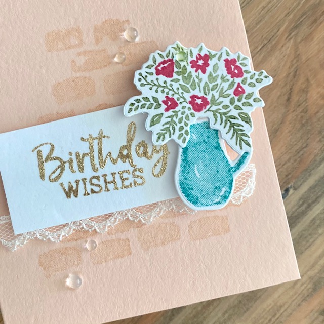 I started with a Petal Pink notecard size (folded measurement is 12.7cm x 8.9 cm) card base. For the background I used Petal Pink ink to stamp the brick image from the Welcoming Window stamp set. The flower and leave images were stamped with Melon Mambo and Mossy Meadow ink. The vase with Bermuda Bay ink. I used the coordinating dies to cut out the pieces. The ‘Birthday Wishes’ sentiment from the Fancy Phrases stamp set was created with Versamark ink, Heat & Stick powder and Gilded Leafing. The Scallop Lace Trim adds even more softness while the clear gems add sparkle!