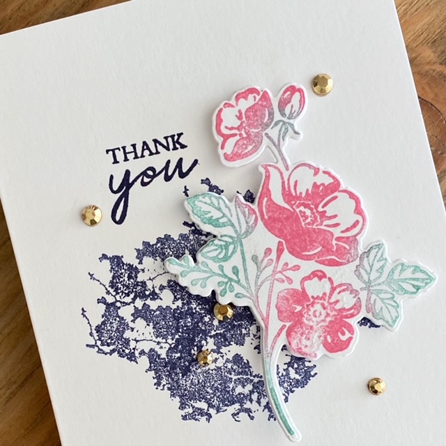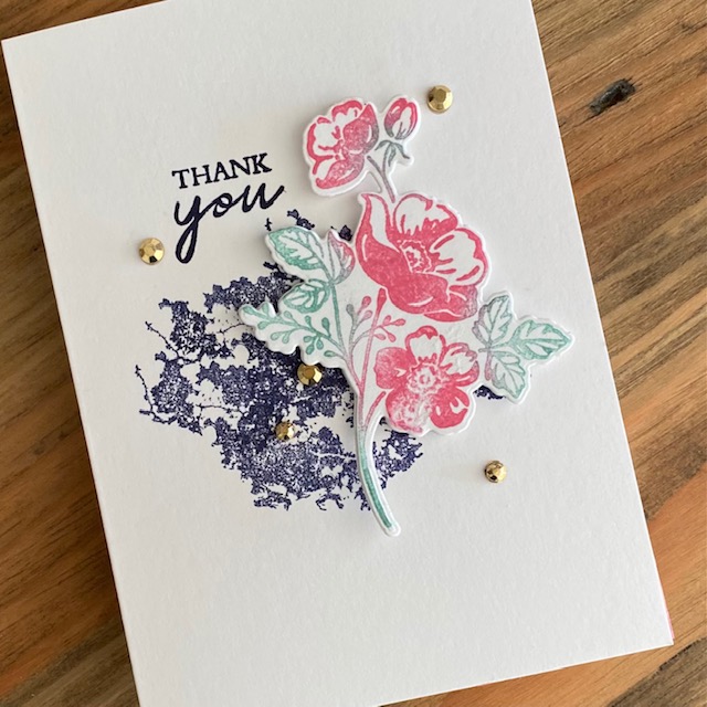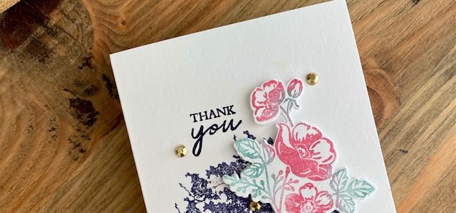 I kept my card really simple and used Sponge Daubers to add colour to the floral stamp. The background stamp (here stamped o with Night of Navy ink on Thick Basic White cardstock is from the Nature’s Harvest stamp set available 3 August 2021 on its own or as part of the Nature’s Harvest bundle!