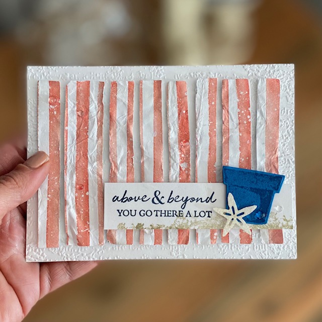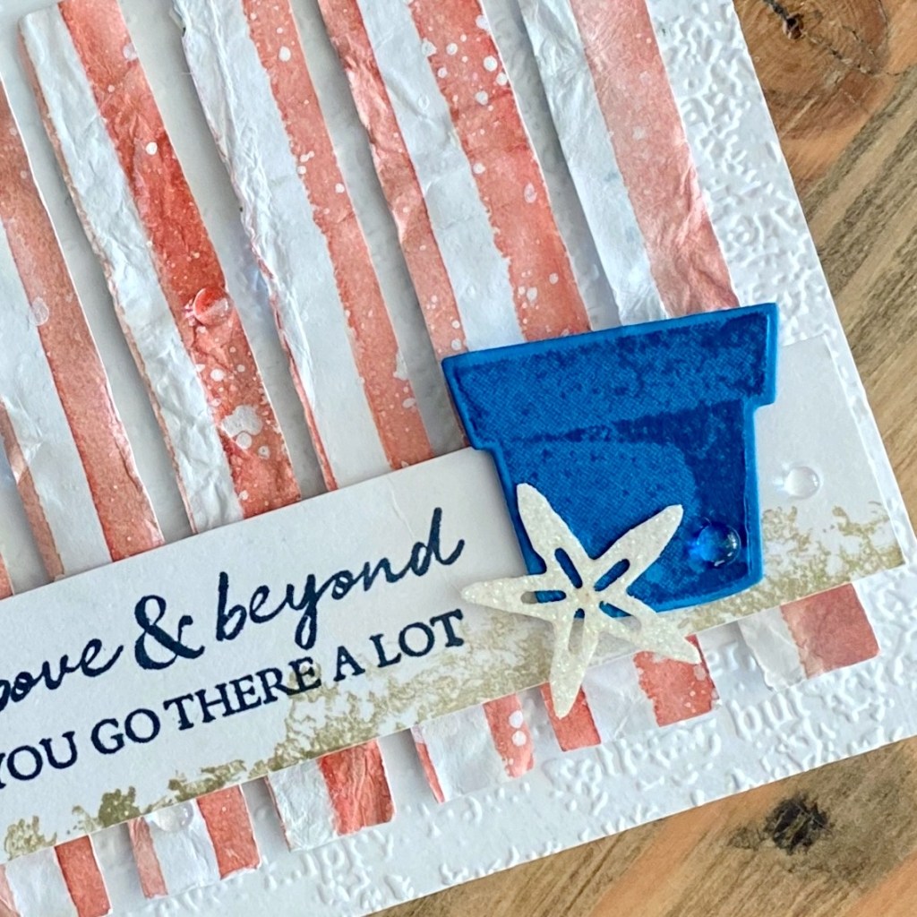 I really had fun creating today’s card! It started with the striped patterned paper from the You’re a Peach Designer Series Paper pack – the Calypso Coral watercolour stripes reminded me of striped beach towels and coral! I pulled in the Shaded Summer stamp set for the sentiment and used a pot from the Plentiful Plants Bundle for a sand bucket. The beach sand was created with a background stamp from the upcoming Nature’s Harvest stamp set (available 3 August 2021). The Timeworn Type #D Embossing Folder will also be part of the upcoming Harvest Meadow Suite and I used it to add interest to the Basic White card base.