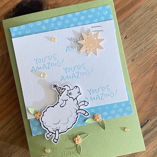 Speaking of SALE-a-Bration… Take a look at this cute card I made with the Counting Sheep Stamp set (FREE with a $90.00 order in Australia) and the Sheep Dies (FREE with a $90.00 order in Australia)!