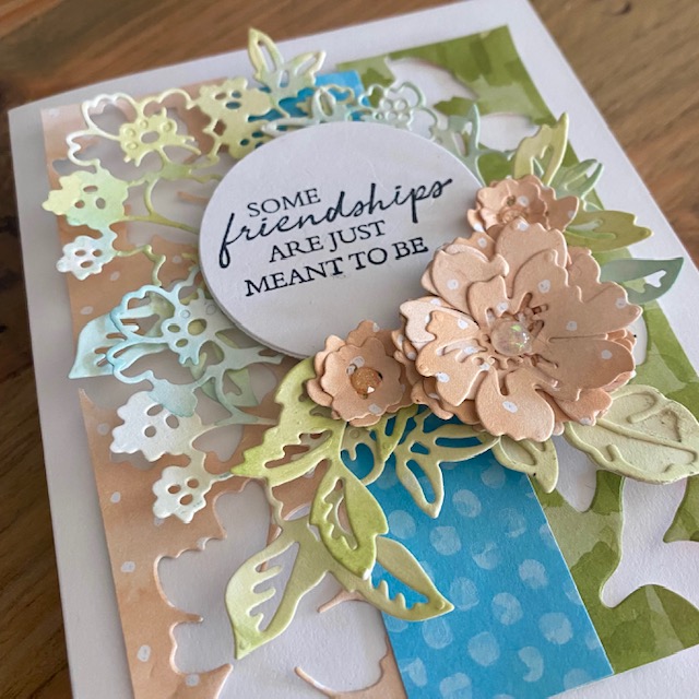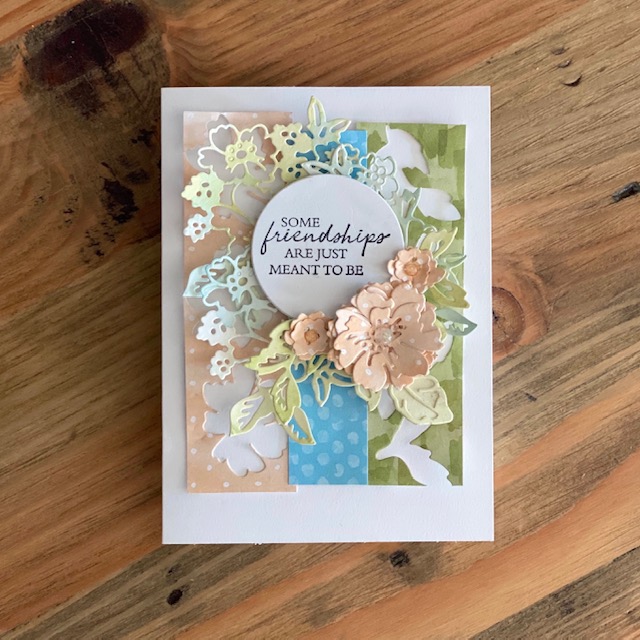 Instead of using adhesive all over the back of the Designer Series Paper strips, I used Glue Dots here and there – this way the strips were not adhere flat to the card front and instead had a little dimension to them. Stagger the flower die cut pieces when assembling the flowers with Glue Dots.