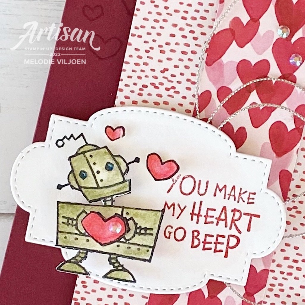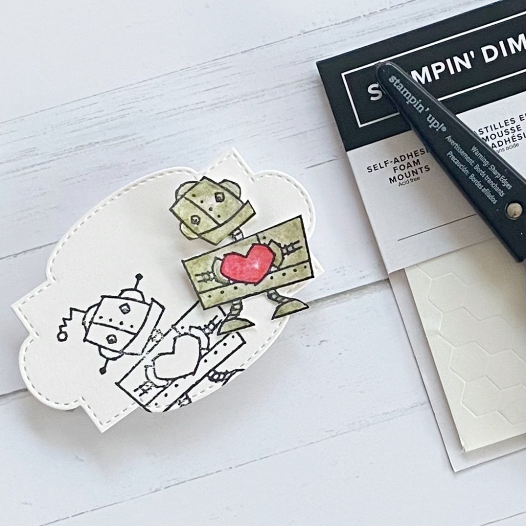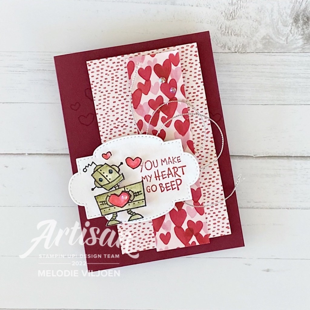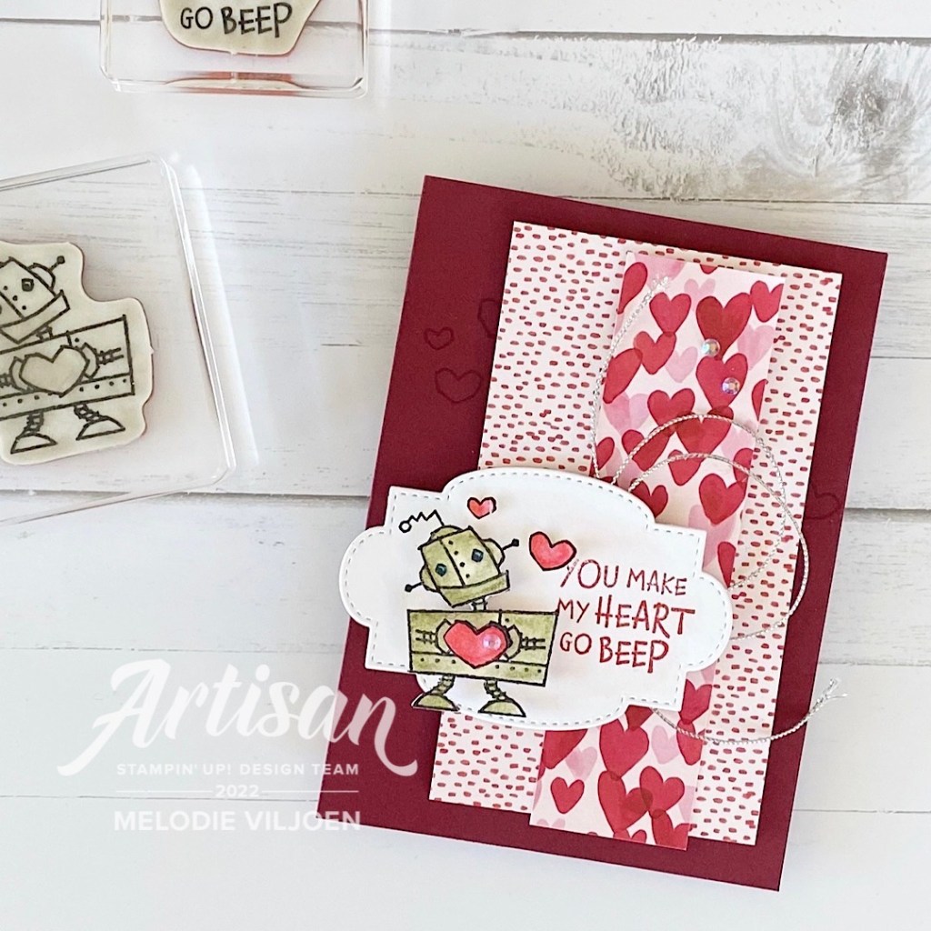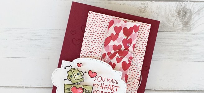 Hello again! Raise your hand if you celebrate Valentine’s Day! It isn’t a big thing in our house, but how could I not create a Valentine’s card with the adorable Nuts & Bolts stamp set in the new Mini catalogue!