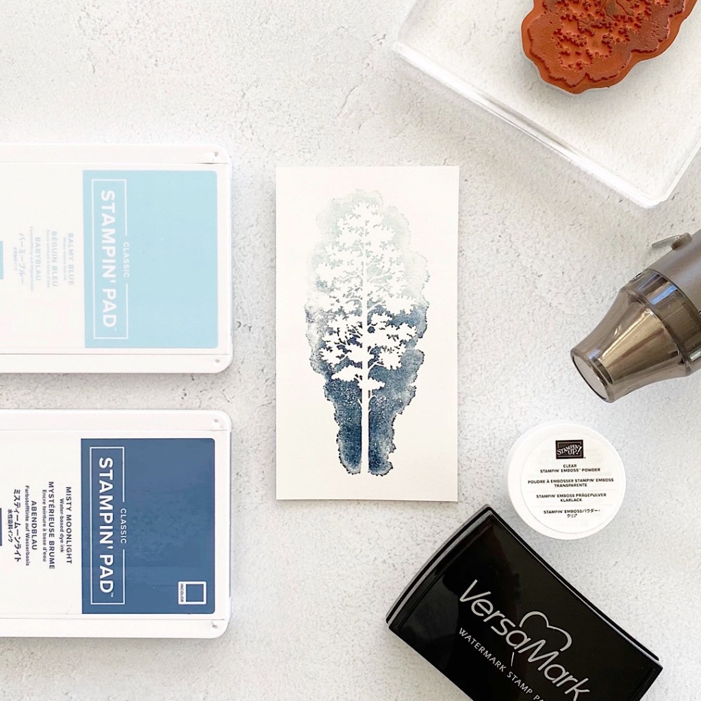 From the very fist time I saw the beautiful Amazing Silhouettes stamp set, I wanted to colour the beautiful tree! I used an emboss resist technique with Versamark ink and Clear Stampin’ Emboss Powder with Balmy Blue and Misty Moonlight to create a soft and dreamy looking background.