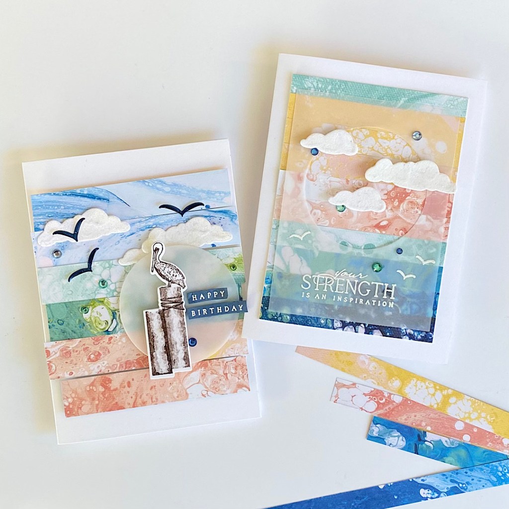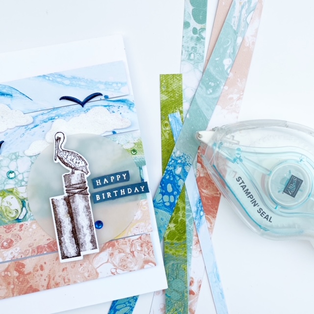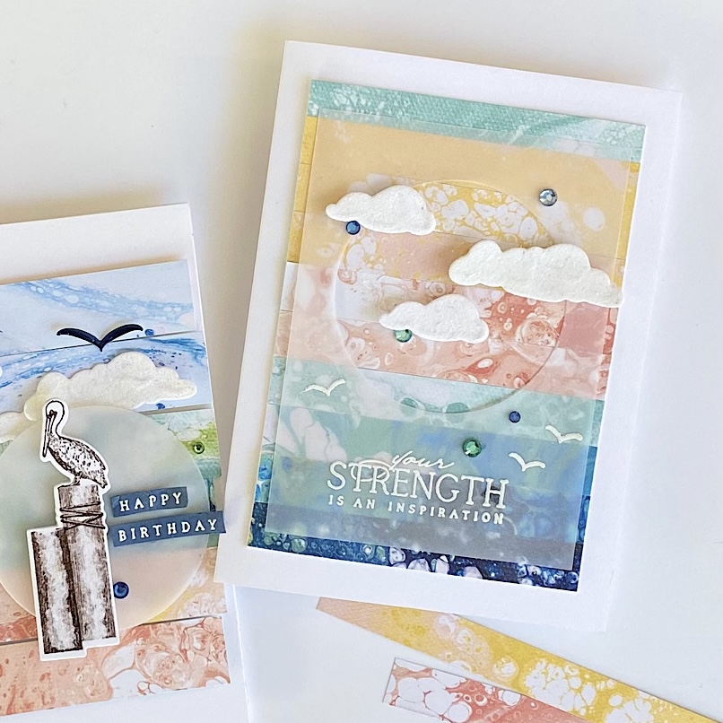 Tip! Use Vellum cardstock to create a focal point on a busy background! For the Pelican card I used two layers of the Vellum circle.