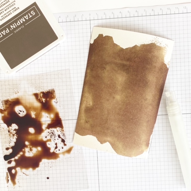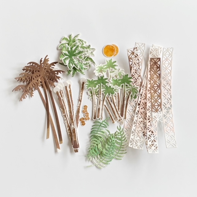 I used Garden Green and Early Espresso for the Palm Trees, Cinnamon Cider for the coconut clusters and Pumpkin Pie for the sun. I inked, spritzed and stamped all the pieces to my hearts content! Boy did I have fun! In the end I only used some of the pieces but I am certain they will be put to good use in a future project (or two)!