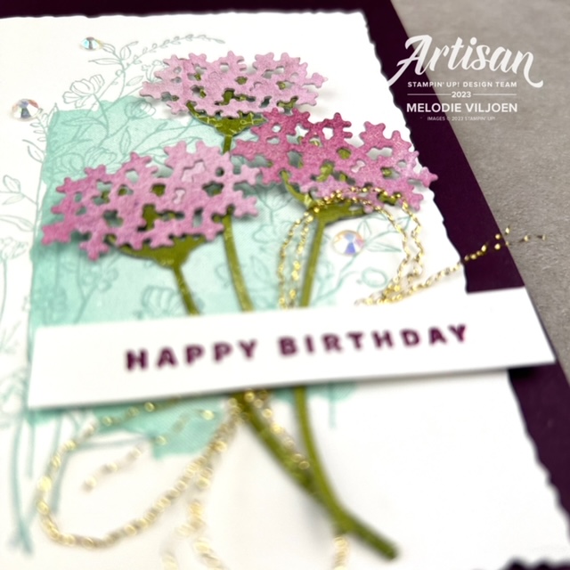 I used one of the Oceanfront stamp set images to create a backdrop for the dainty flowers and by pulling apart the Gold trim, I was able to create a dainty ‘faux bow’ for added shimmer and shine!