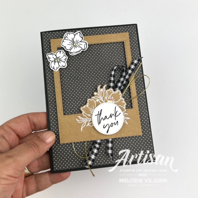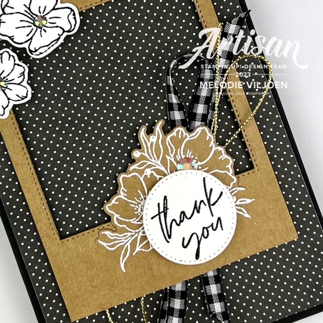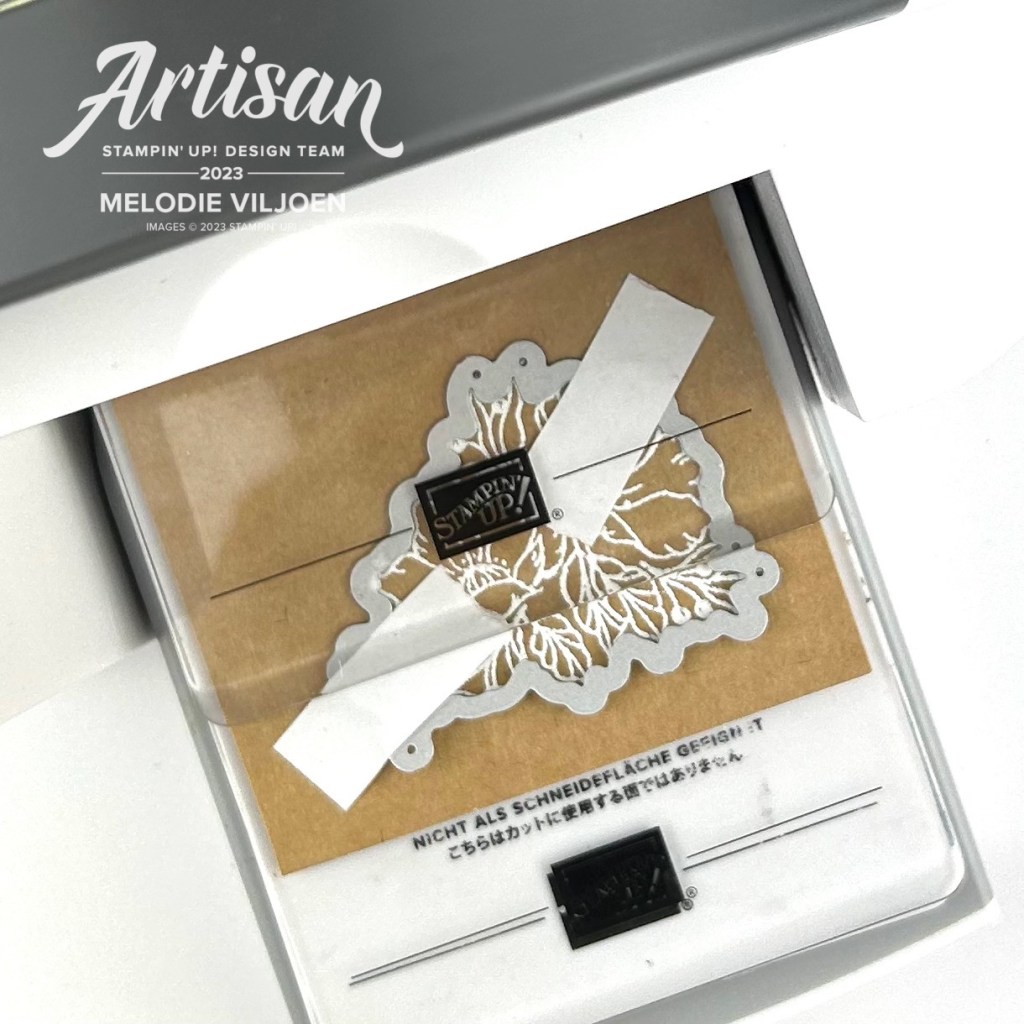 Step 3 – Place the large square die from the Stylish Shapes Dies so the bottom part of the square slides underneath the partially die cut image, then run through your Stampin’ Cut & Emboss Machine.