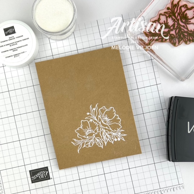 Step 1 – Stamp or heat emboss the floral image from the Framed Florets Stamp Set on to a piece of cardstock measuring 3-1/4″ x 4-1/4″ (8.2cm x 10.7 cm).