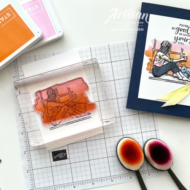 Stamp the image with Memento Tuxedo Black Ink onto Basic White Cardstock. Stamp the background image from the Oceanfront Stamp Set over the Black stamped image. I used Bubble Bath Ink for the top and Pumpkin Pie Ink for the bottom of the sky. I softened the line between the two colours with Blending Brushes.