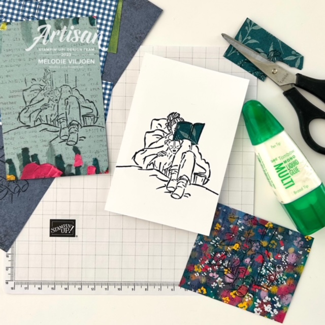 Stamp the image with Memento Tuxedo Black Ink onto Basic White cardstock. Let the fun begin! Who doesn’t love a bit of fussy cutting! Stamp the same image (or the part you would like to ‘colour’) with Memento Tuxedo Black Ink onto Designer Series Paper of your choice – I use scraps of Designer Series Paper for this. Multipurpose Liquid Glue is the perfect adhesive to use for piecing in the paper (it allows for some wiggle time).