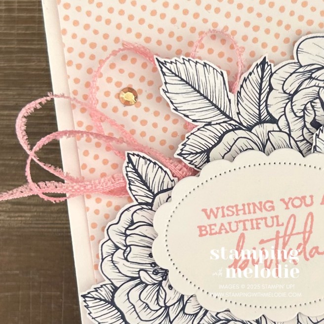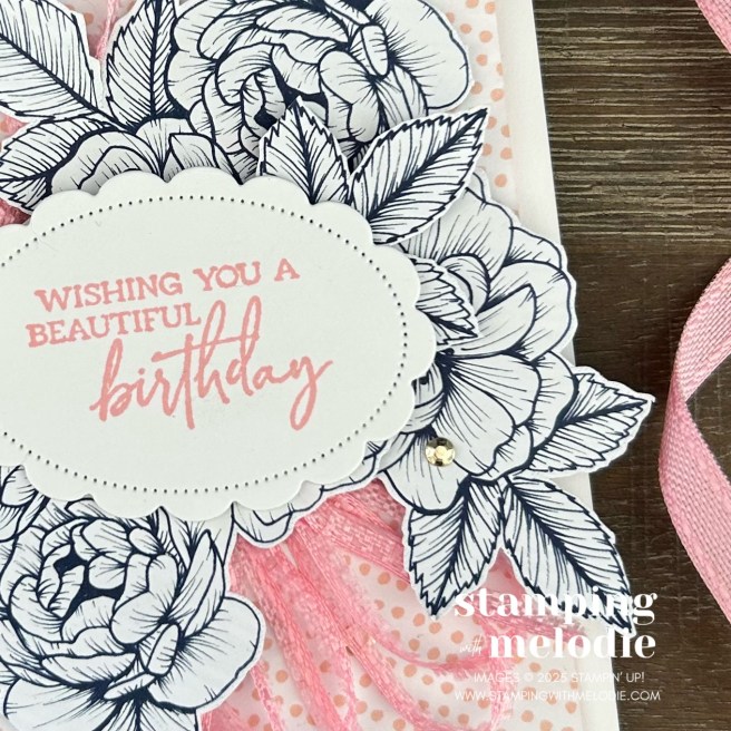 For my card, I used the soft polka dot pattern from the Fruit Salad Designer Series Paper. This paper is a Sale-A-Bration freebie with a $100 buy. I used it as a background. The bold Night of Navy floral images are from the Serene Love Designer Series Paper. The sentiment comes from the Sketched Butterflies Stamp set and the label die is from the Unbounded Love Dies.